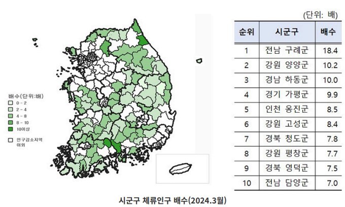 모든 인구감소지역에서 등록인구보다 체류인구가 많았으며, 특히 전남 구례군은 체류인구가 등록인구의 18.4배로 가장 높았다. 등록인구 대비 체류인구 배수는 강원도가 5배로 가장 컸고, 체류인구 중 타 시도 거주자 비중은 충북이 79.9%로 가장 높았다.